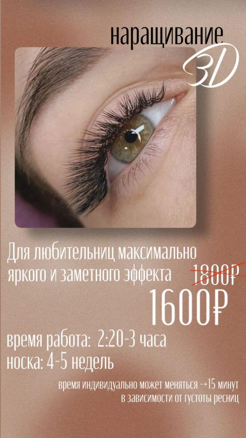 - 3D-наращивание ресниц 1600 ₽ за услугу