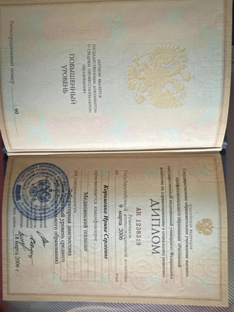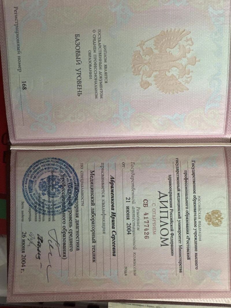 - ГОУ ВПО «Ростовский государственный медицинский университет Федерального агентства по здравоохранению и социальному развитию», специальность «лабораторная диагностика (повышенный уровень среднего профессионального образования)», 2004–2006 гг.