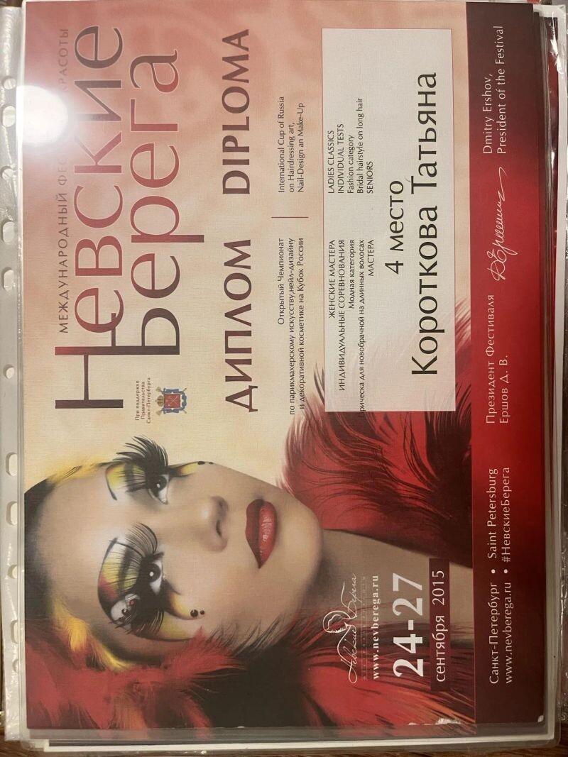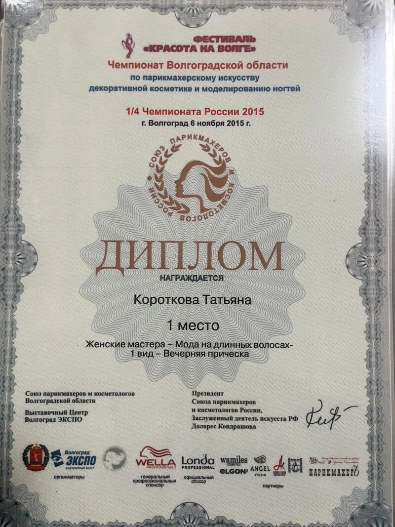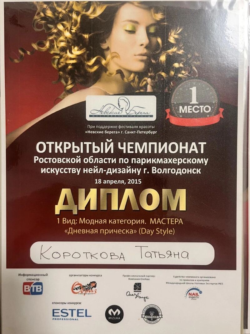 - Открытый чемпионат Ростовской области по парикмахерскому искусству нейл-дизайну г. Волгодонск, категория «Дневная прическа», 1 место, 2015 г.