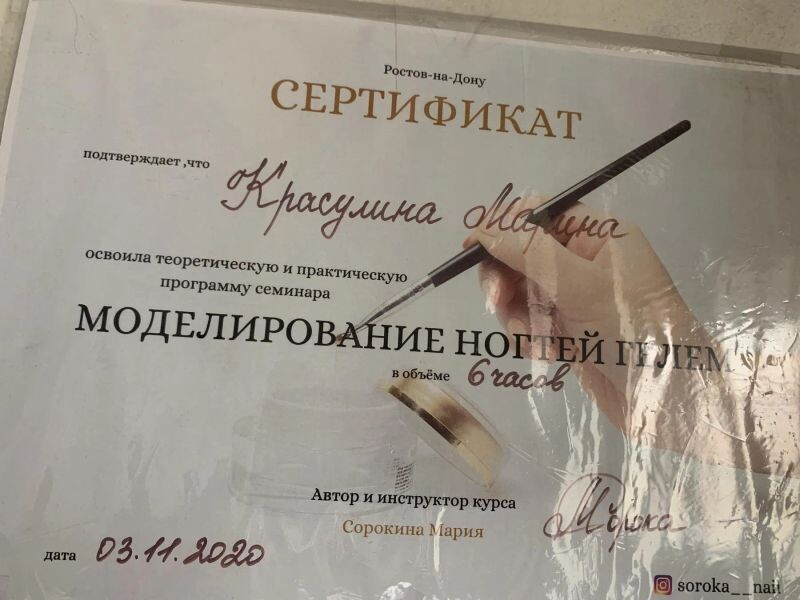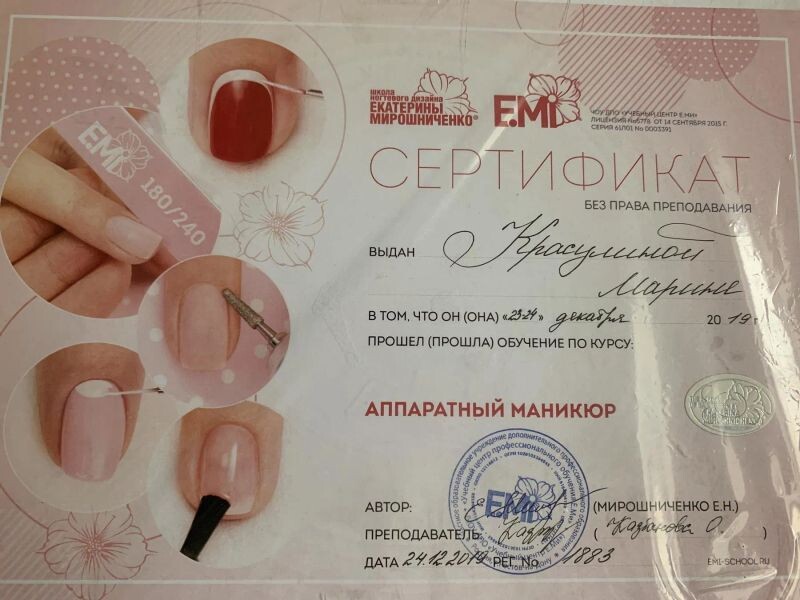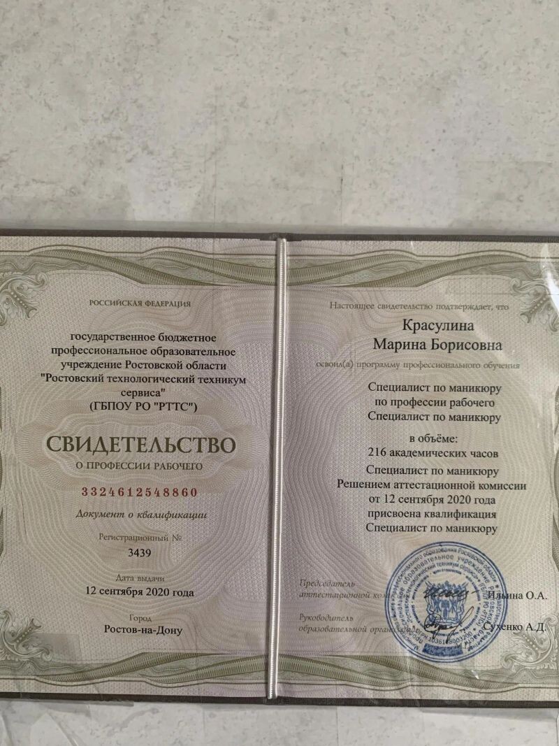 - Ростовский технологический колледж сервиса, специалист по маникюру, 2020 г.