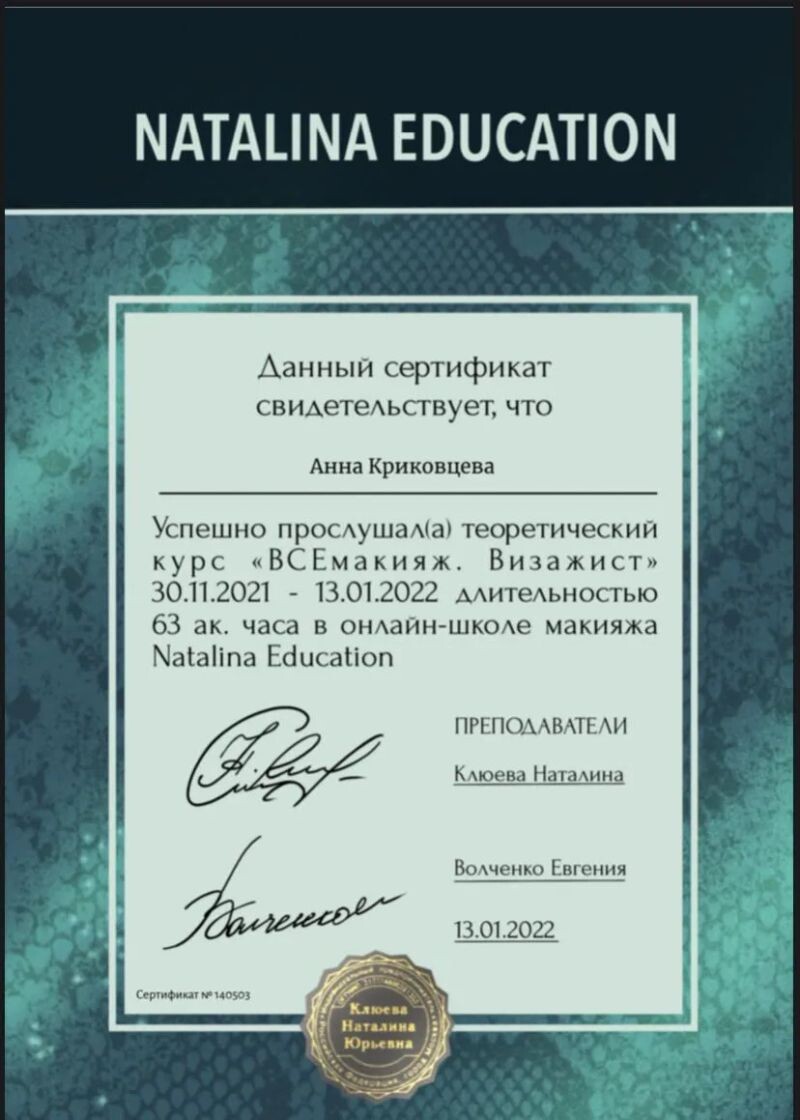 - NATALINA EDUCATION, курс «ВСЕмакияж. Визажист», 2022 г.