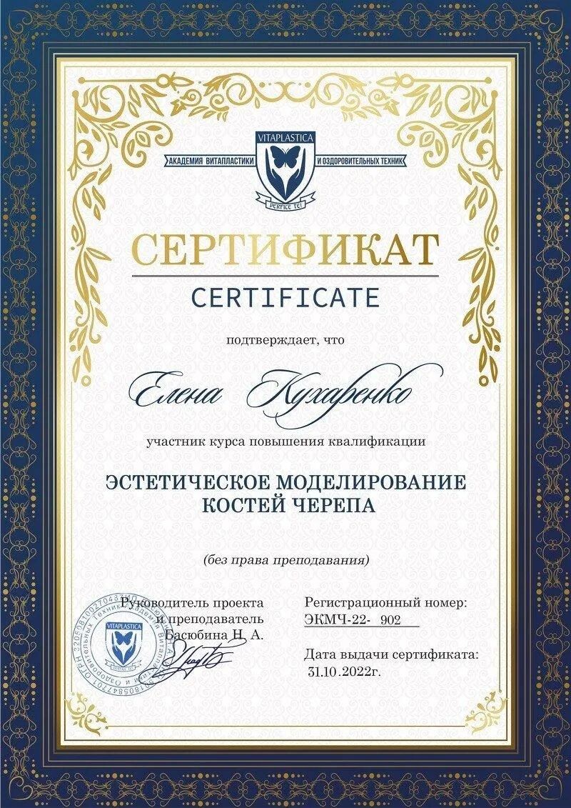 - Академия витапластики и оздоровительных техник, курс «Эстетическое моделирование костей черепа», 2022 г.