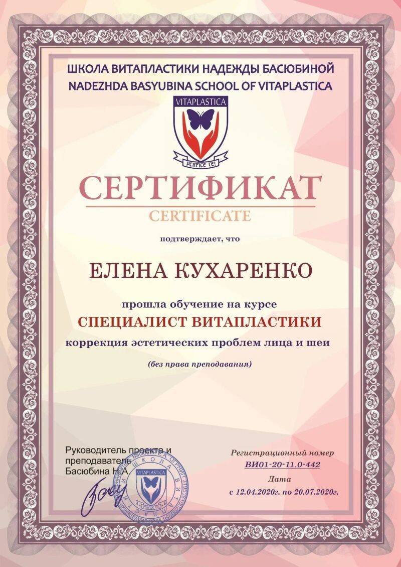- Школа витапластики Надежды Басюбиной, курс «Специалист витапластики: коррекция эстетических проблем лица и шеи», 2020 г.
