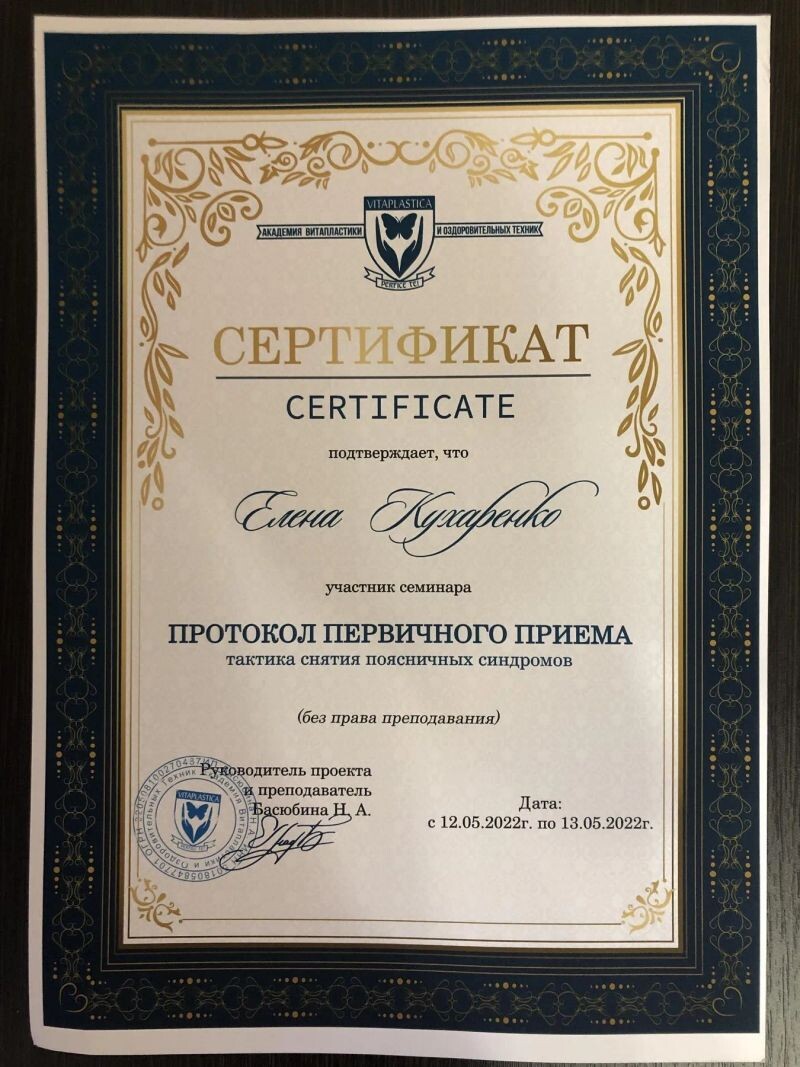 - Академия витапластики и оздоровительных техник, семинар «Протокол первичного приёма: тактика снятия поясничных синдромов», 2022 г.