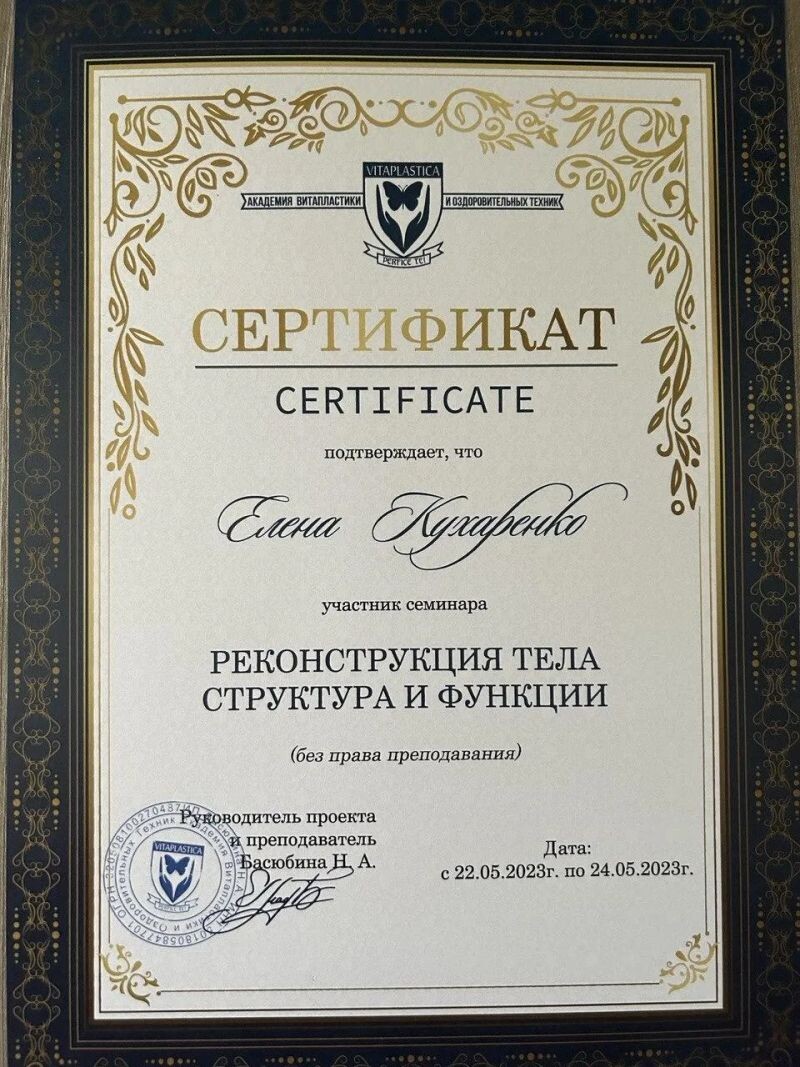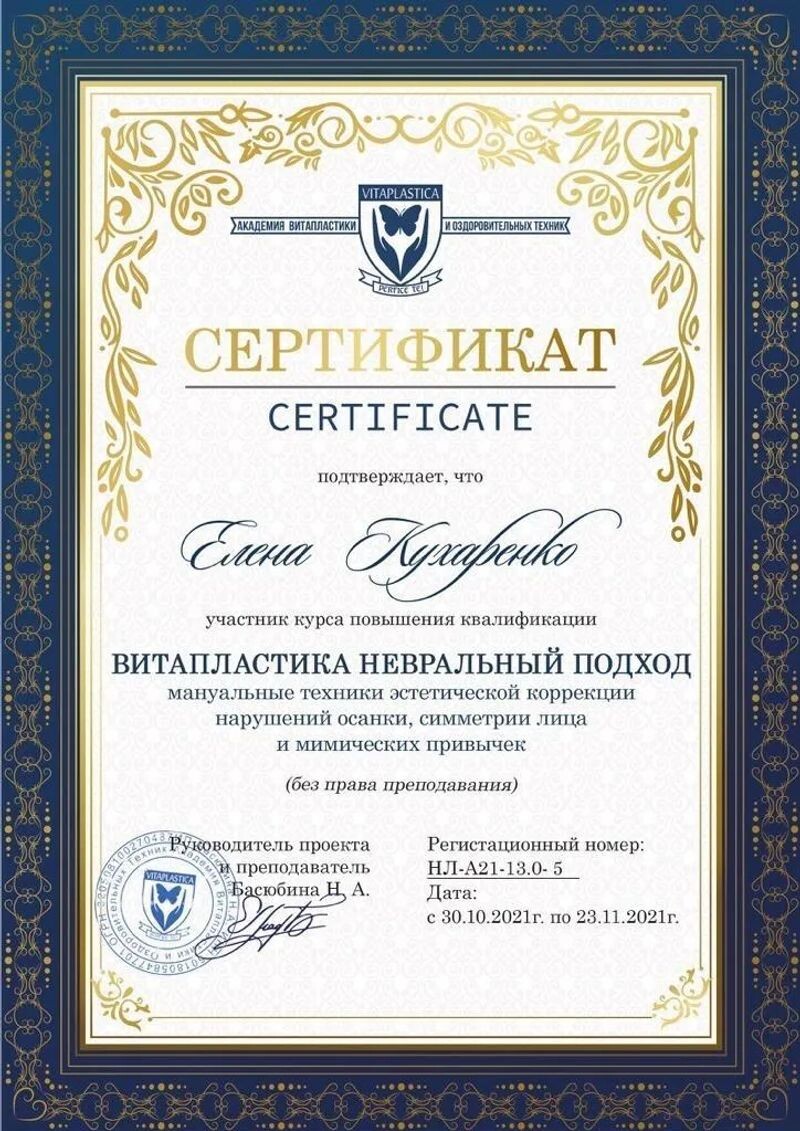 - Академия витапластики и оздоровительных техник, курс «Витапластика невральный подход: мануальные техники эстетической коррекции нарушений осанки, симметрии лица и мимических привычек», 2021 г.