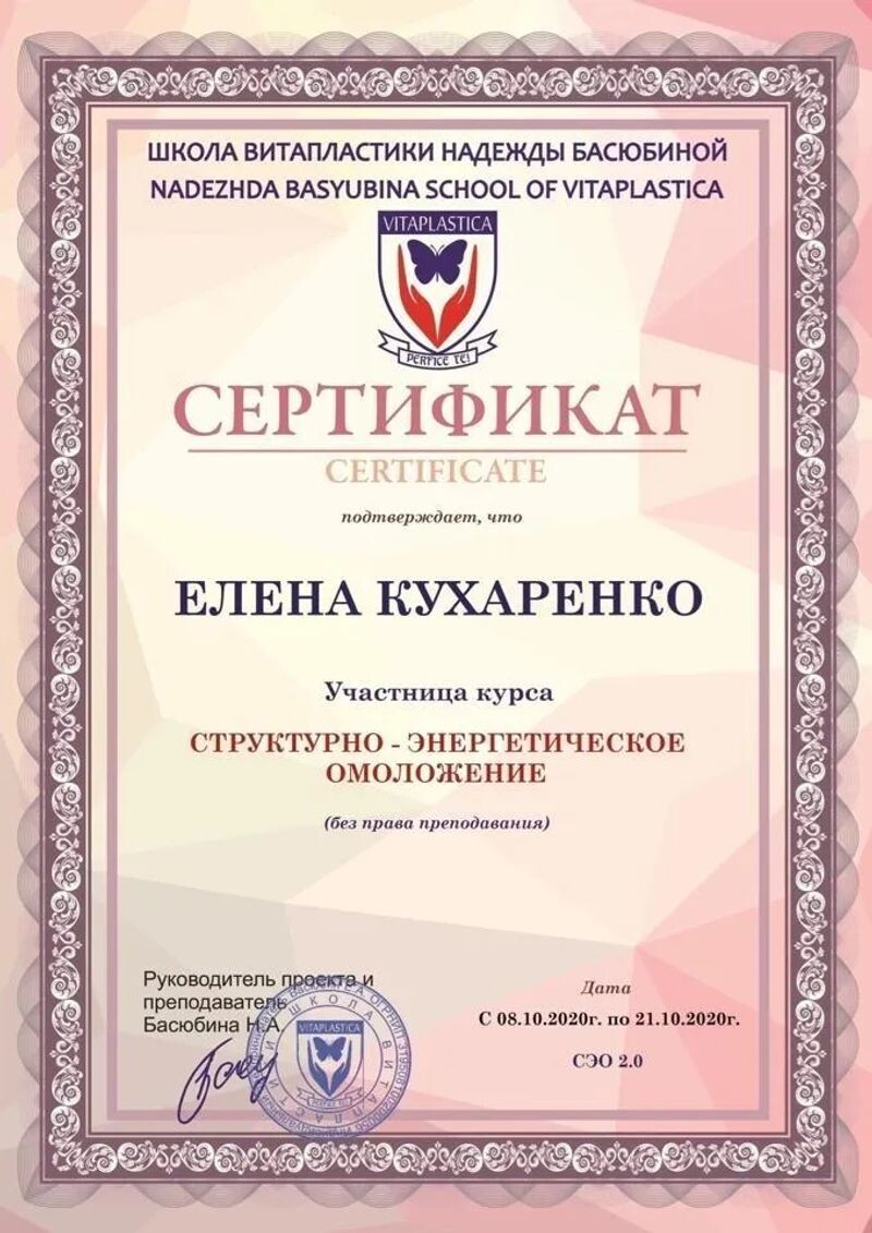 - Школа витапластики Надежды Басюбиной, курс «Структурно-энергетическое омоложение», 2020 г.