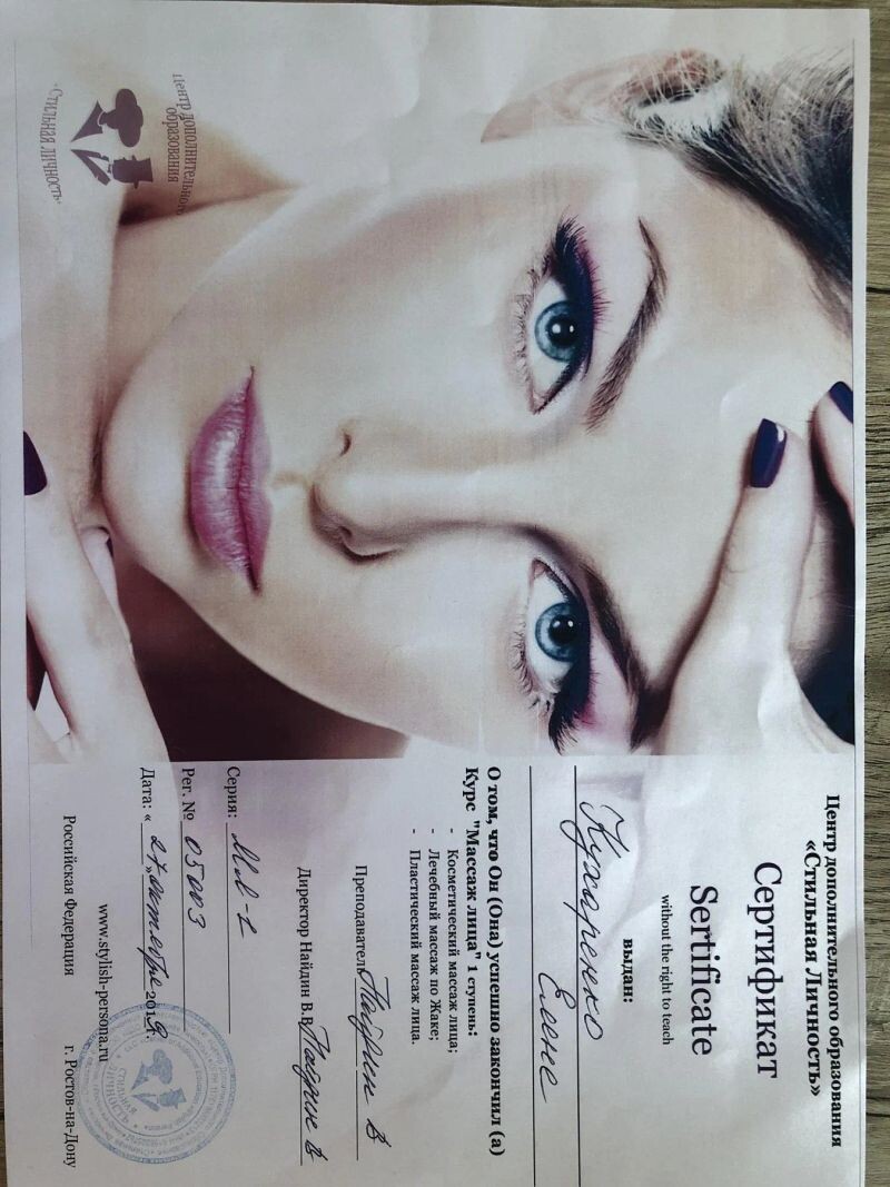 - ЦДО «Стильная Личность», курс «Массаж лица. 1 ступень», 2019 г.