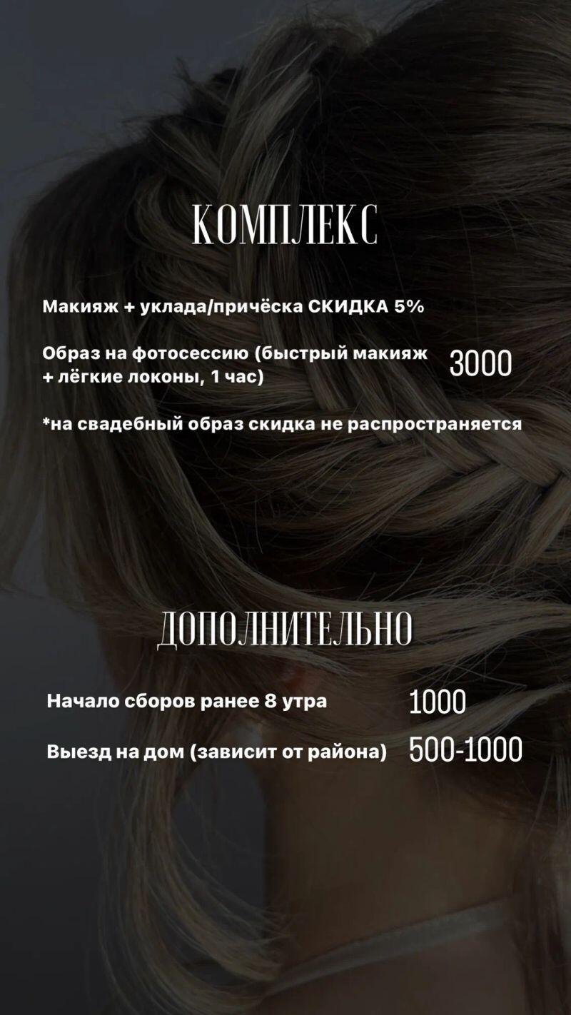 - Причёски для фотосессии 1000 - 2000 ₽ за усл.выезд оплачивается отдельно