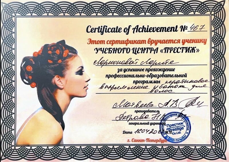 - Учебный центр «Престиж», кератиновое выпрямление и молекулярное восстановление для волос, 2021 г.