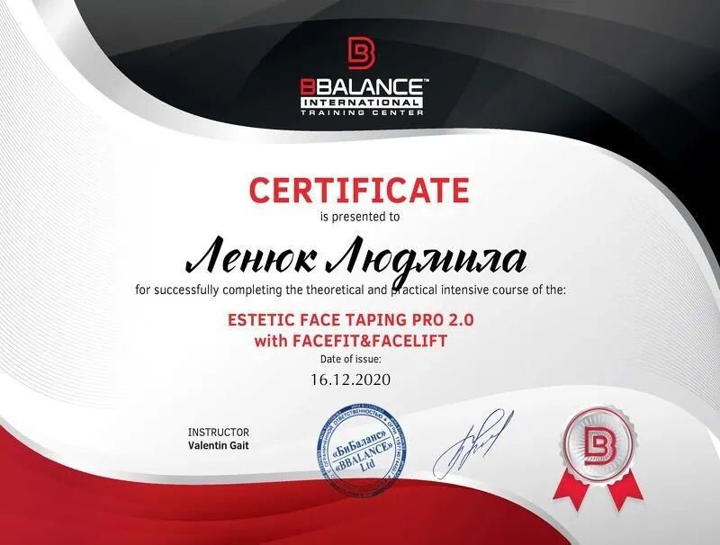 - Bbalance, курс «Эстетическое тейпирование лица Про 2.0, фейсфитнес и фейслифтинг», 2020 г.