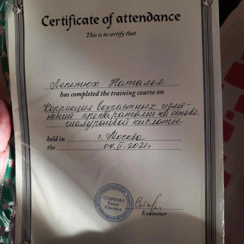 - Старкова Елена, сертификат по курсу «Коррекция возрастных изменений препаратами на основе гиалуроновой кислоты» (Москва), 2021 г.