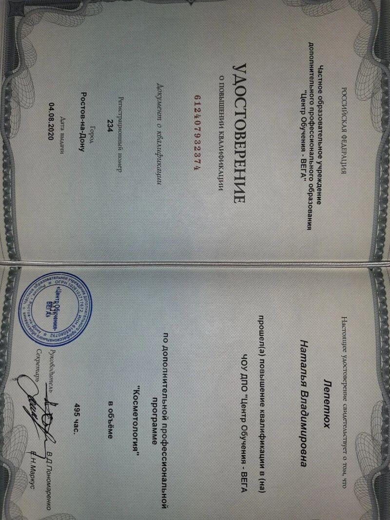 - ЧОУ Центр обучения ВЕГА, дополнительная профессиональная программа «Косметология», 2019–2020 гг.
