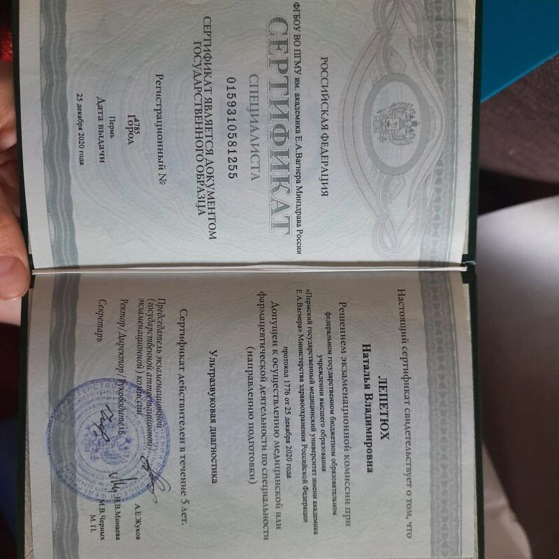 - Пермский государственный медицинский университет, сертификат специалиста по ультразвуковой диагностике, 2020 г.