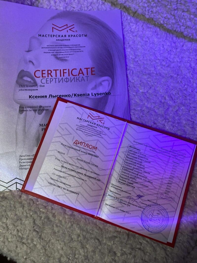 - Учебный центр «Мастерская красоты», курс «Мастер ногтевого сервиса. Расширенный курс», квалификация — специалист по маникюру, 2022 г.