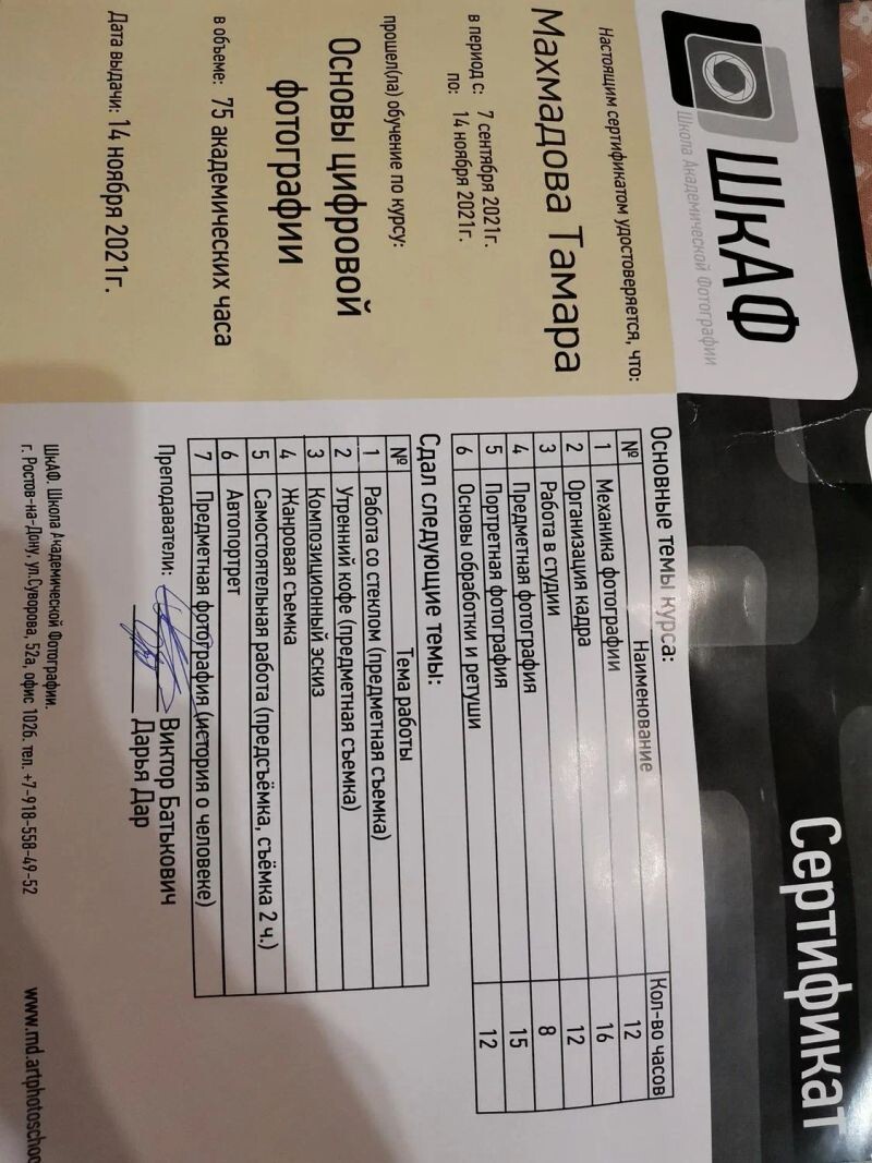 - Фотошкола «Шкаф», курс «Основы цифровой фотографии», 2021 г.