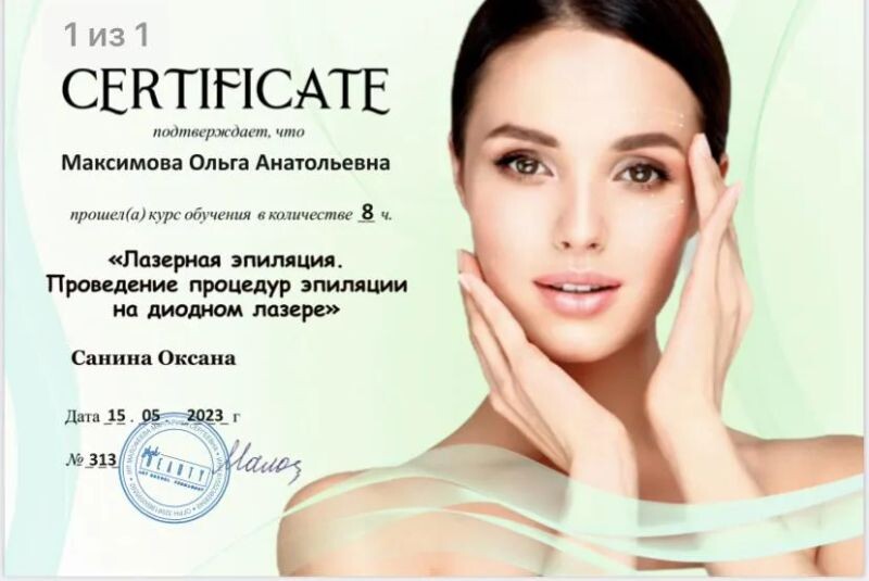 - Курс «Лазерная эпиляция. Проведение процедур эпиляции на диодном лазере», 2023 г.