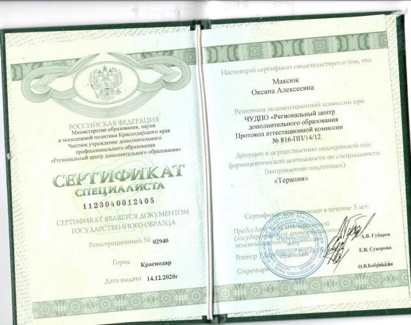 - Региональный центр дополнительного образования, терапия (действителен до 2025 года), 2020 г.