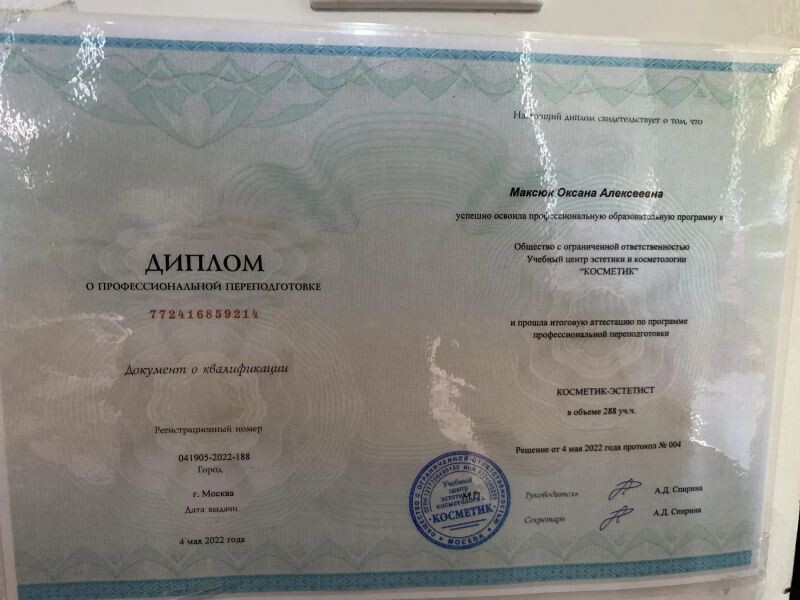 - Учебный центр эстетики и косметологии «Косметик», программа «Косметик-эстетист», 2022 г.