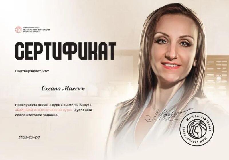 - Первая онлайн-школа безопасных инъекций Людмилы Варуха, онлайн-курс «Большой анатомический курс», 2023 г.