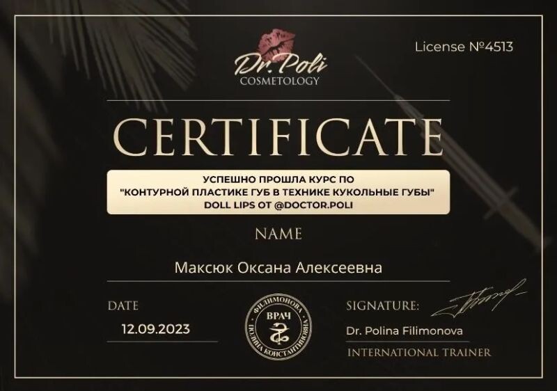 - Dr. Poli Cosmetology, курс «Контурная пластика губ в технике кукольные губы», 2023 г.