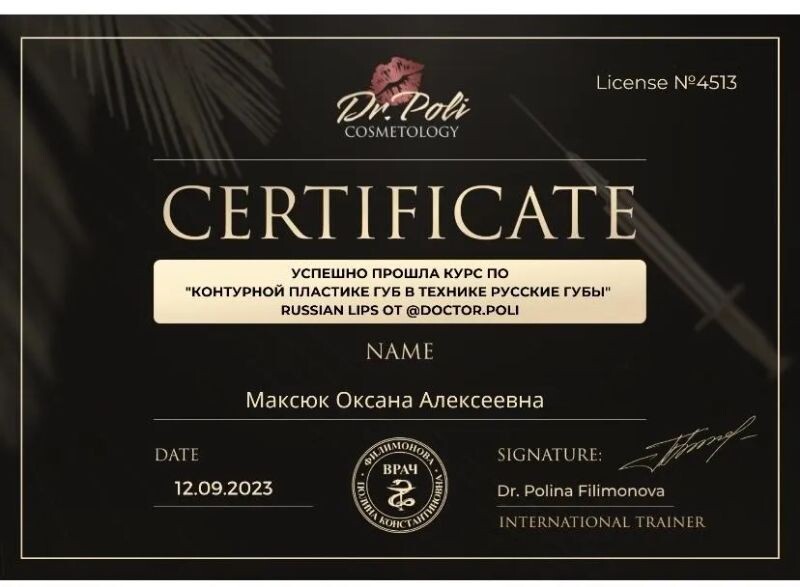 - Dr. Poli Cosmetology, курс «Контурная пластика губ в технике русские губы+стрипы», 2023 г.