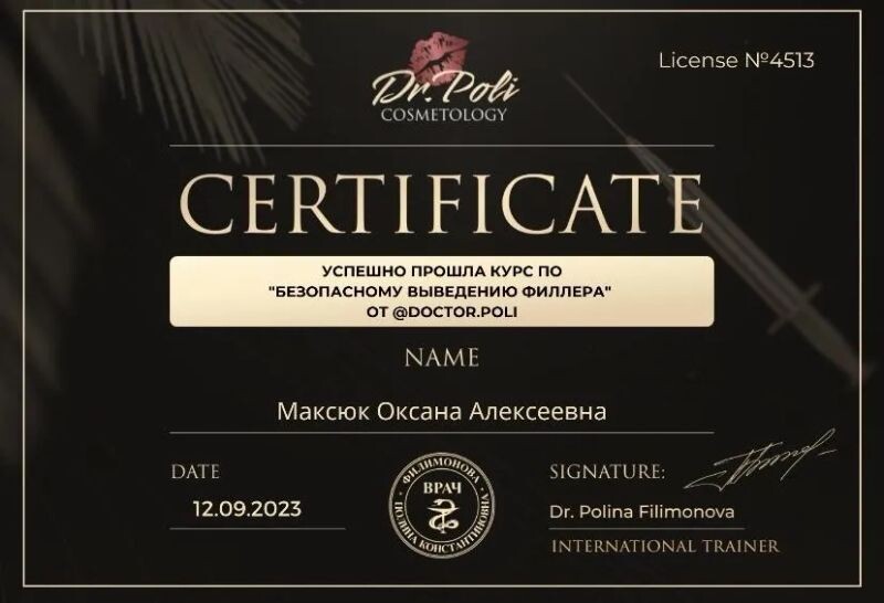 - Dr. Poli Cosmetology, курс «Безопасное выведение филлера», 2023 г.