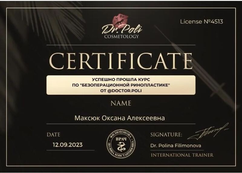 - Dr. Poli Cosmetology, курс «Безоперационная ринопластика», 2023 г.