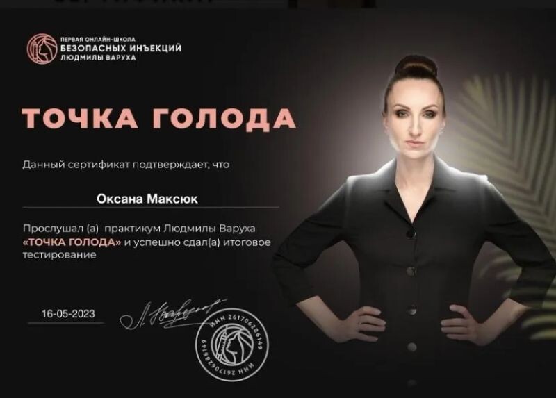 - Первая онлайн-школа безопасных инъекций Людмилы Варуха, практикум «Точка голода», 2023 г.