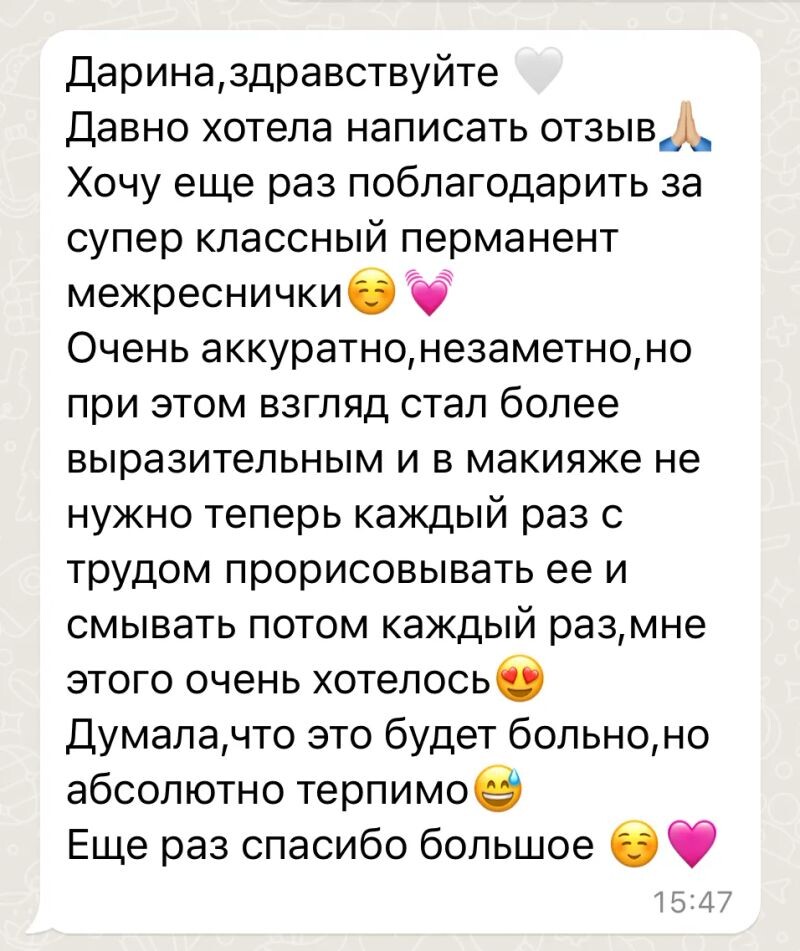 - Ежегодно я прохожу повышение квалификации и улучшаю техники исполнения, одним из последних моих курсов была одна из лучших студий перманентного макияжа города Краснодар (с 2025 г.).