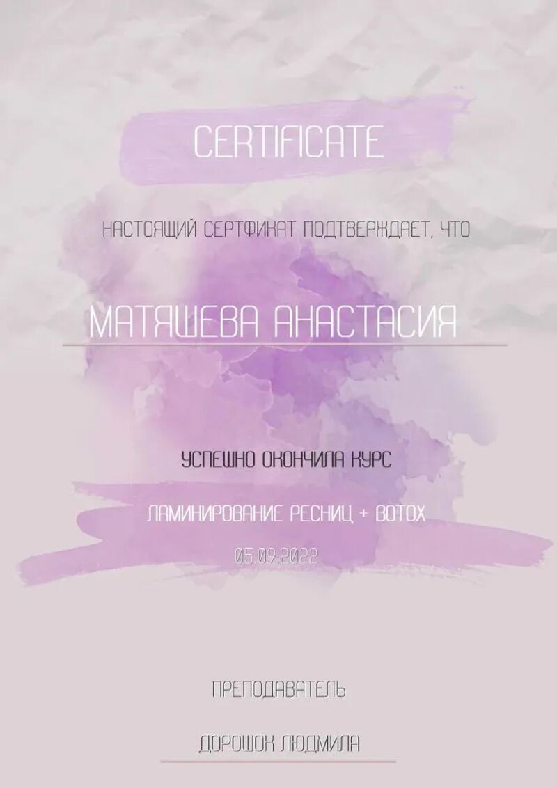 - Курс «Ламинирование ресниц + молекулярное восстановление ресниц», 2022 г.