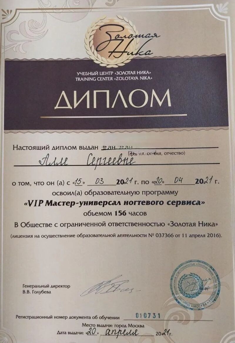 - Учебный центр Золотая Ника г. Москва "VIP мастер-универсал ногтевого сервиса" (с 2021 г.).