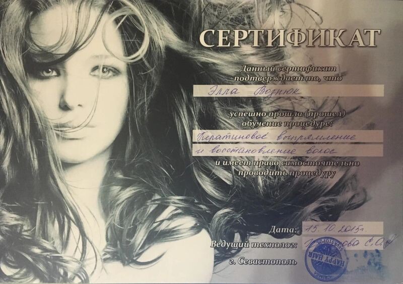 - Happy Hair, обучение по процедуре кератинового выпрямления и восстановления волос, 2015 г.