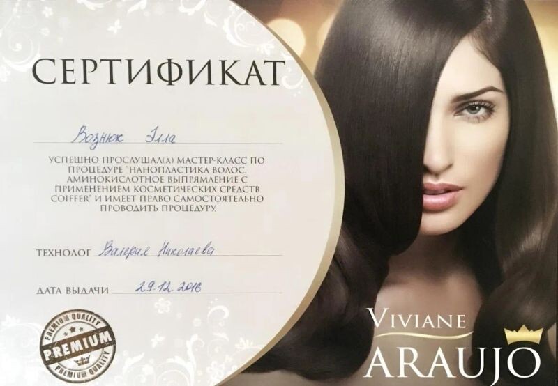 - Viviane Araujo, мастер-класс «Нанопластика волос. Аминокислотное выпрямление с применением косметических средств Coiffer», 2016 г.