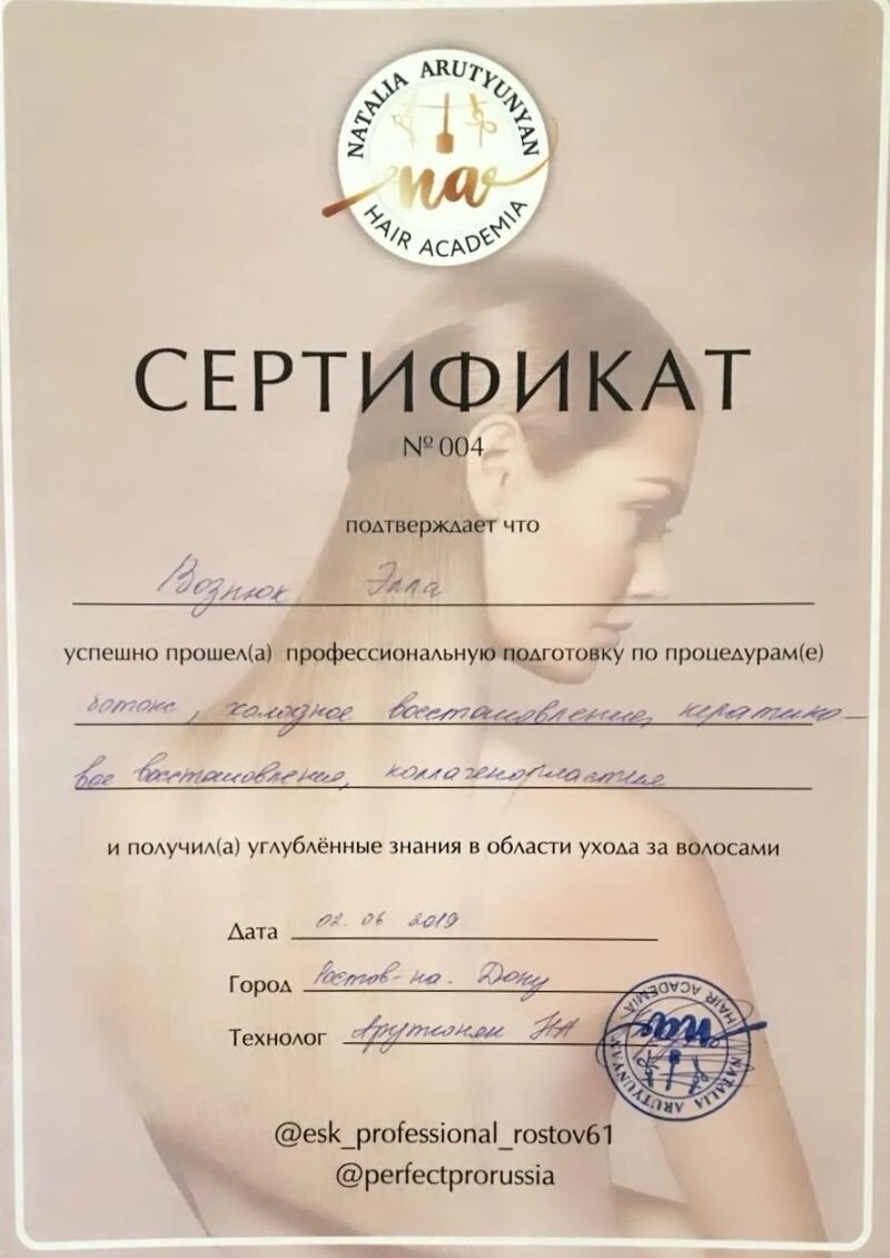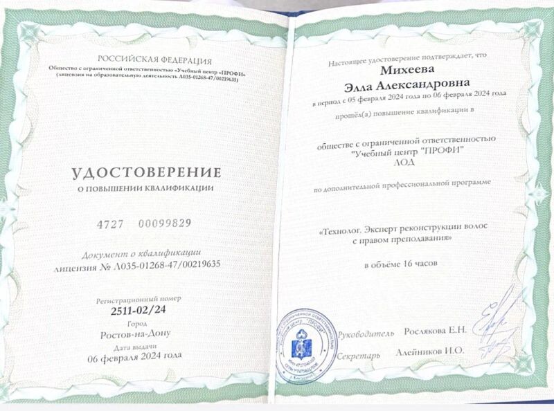 - Учебный центр «Профи» ЛОД, программа «Технолог. Эксперт реконструкции волос с правом преподавания», 2024 г.