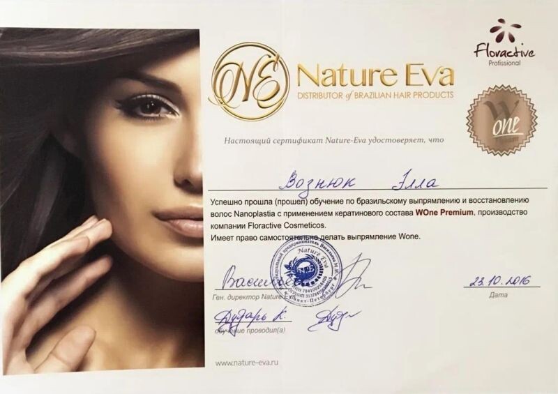 - Nature Eva, обучение по бразильскому выпрямлению и восстановлению волос Nanoplastia с применением кератинового состава WOne Premium, производство компании Floractive Cosmeticos, 2016 г.
