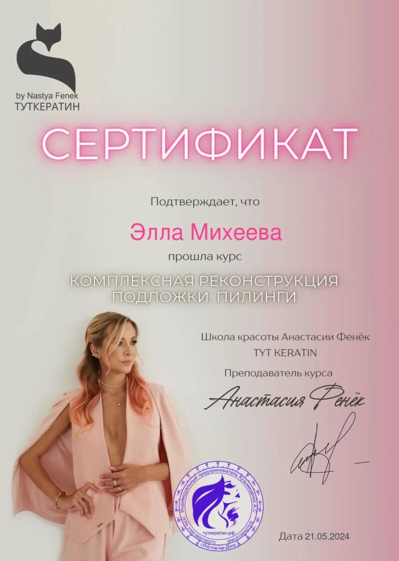 - Школа красоты Анастасии Фенёк, курс «Комплексная реконструкция, подложки. Пилинги», 2024 г.