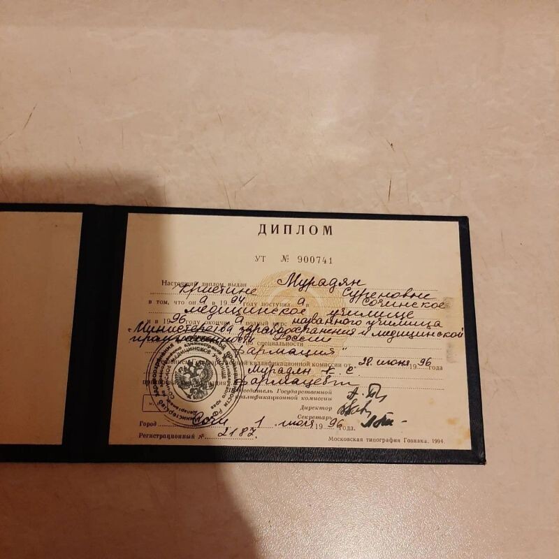 - Сочинское медицинская училище, фармацевт, 1994–1996 гг.