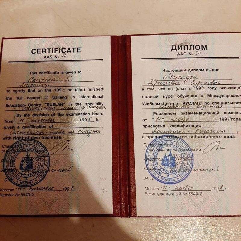 - Учебный центр, косметология, 1997–1998 гг.