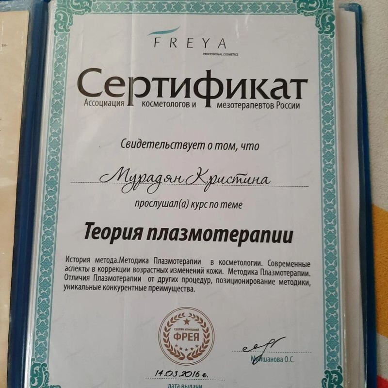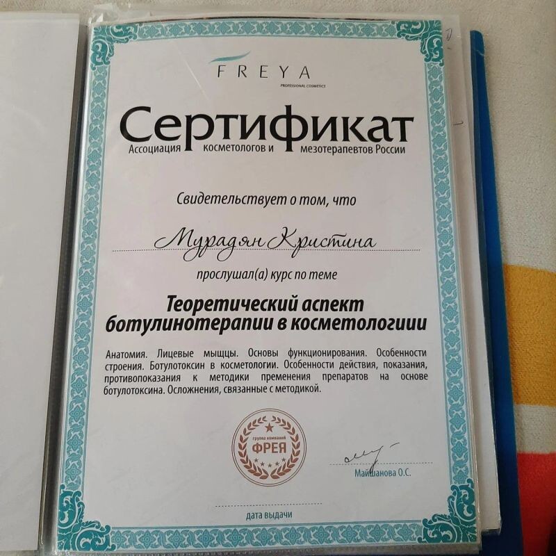 - Фрейя, сертификат по теоретический аспект ботулинотерапии в косметологии (с 2015 г.).