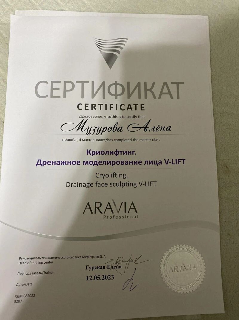 - Aravia Professional, мастер-класс «Криолифтинг. Дренажное моделирование лица V-Lift», 2023 г.