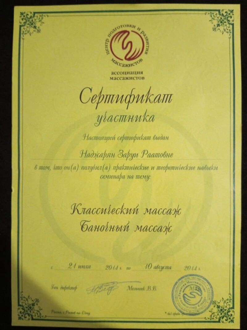 - Центр подготовки и развития массажистов, классический массаж, баночный массаж, 2014 г.
