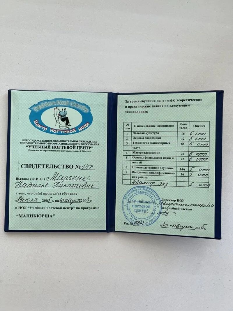 - Учебный ногтевой центр, программа «Маникюрша», 2005 г.