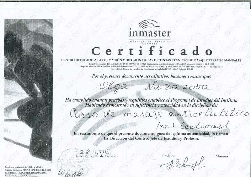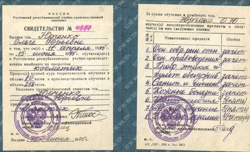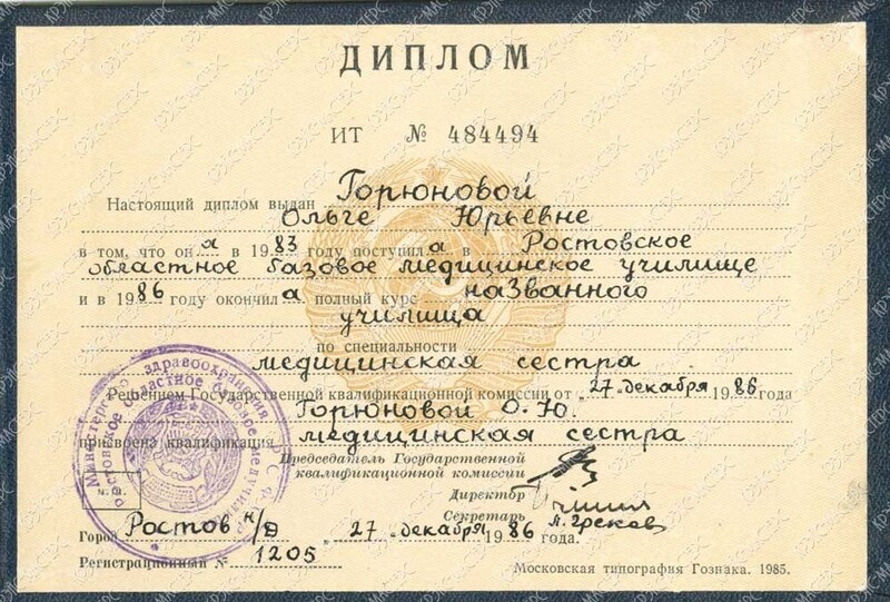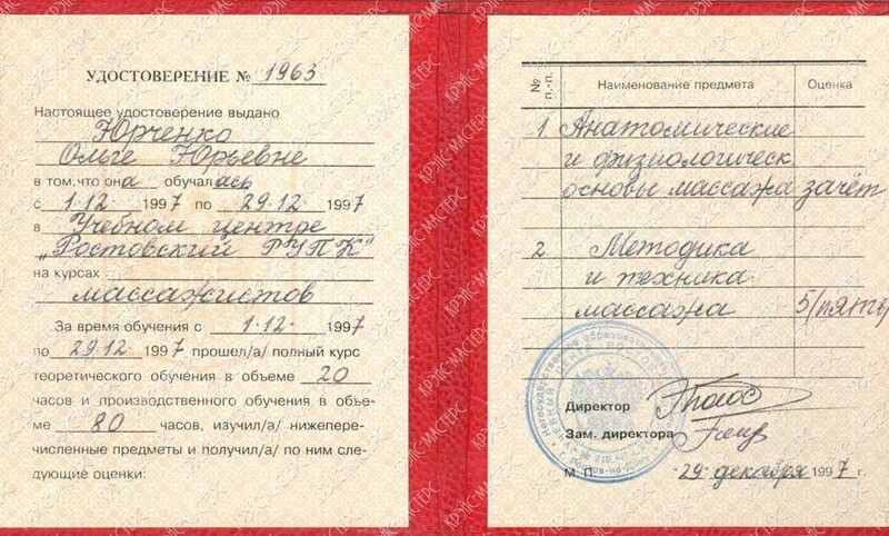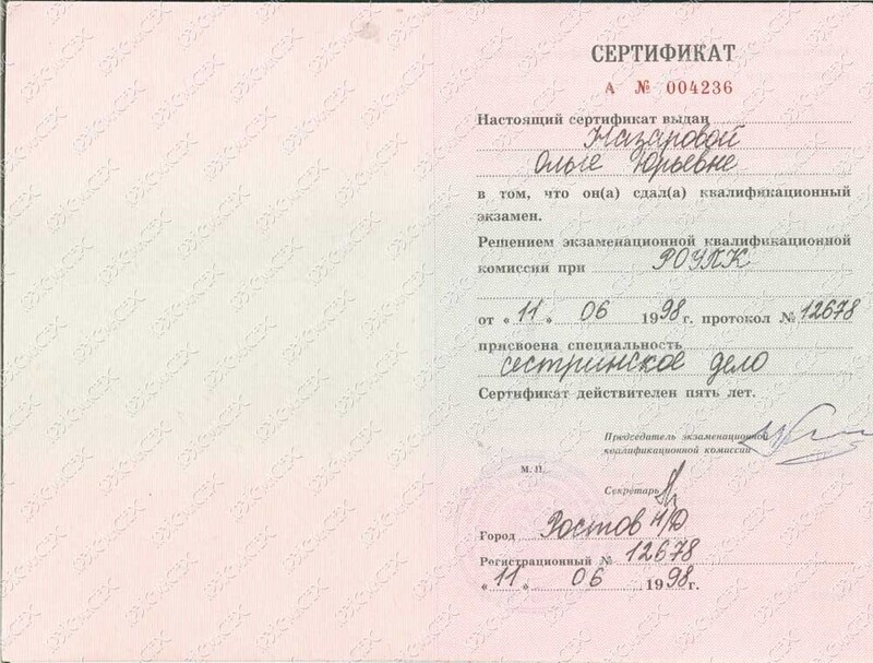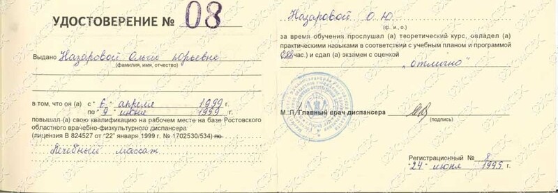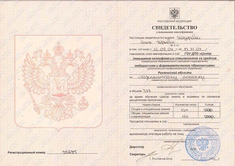 - Ростовский базовый медицинский колледж, специальность – медицинская сестра (1986 г.); Ростовский областной врачебно-физкультурный диспансер, специальность – массаж (1999 г.); Ростовский республиканский УПК, специальность – косметолог-эстетист (1995 г.); последняя сертификация по массажу – при госпитале МВД (2013 г.).