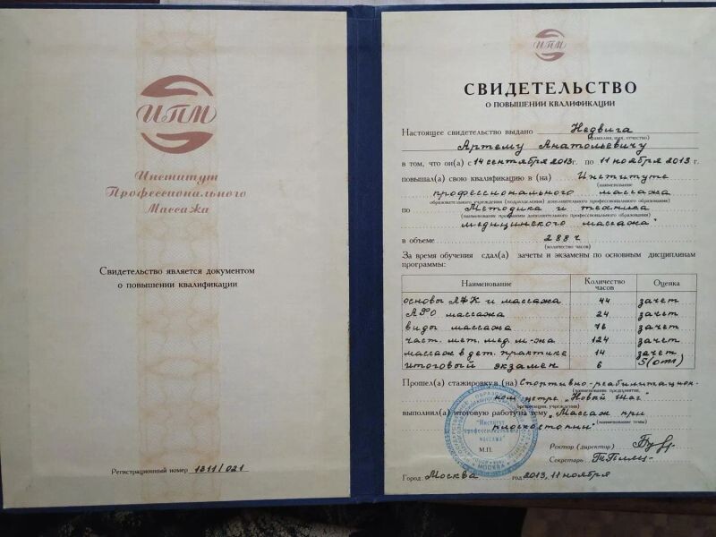 - Институт профессионального массажа, методика и техника медицинского массажа, 2012–2013 гг.