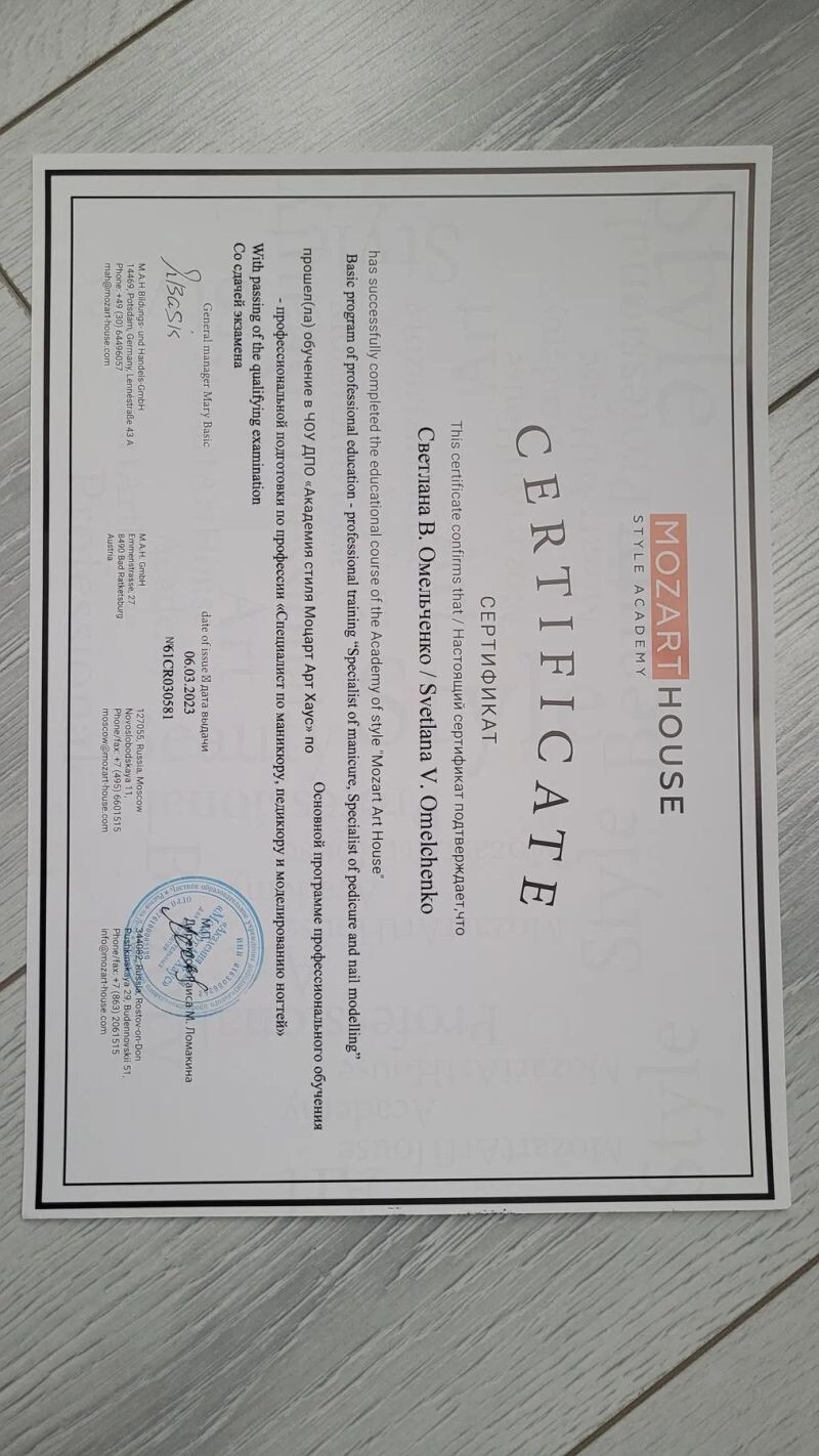 - ЧОУ ДПО «Академия стиля Моцарт Арт Хаус» обучение по профессии «Специалист по маникюру, педикюру и моделированию ногтей», 2023 г.