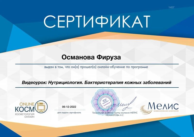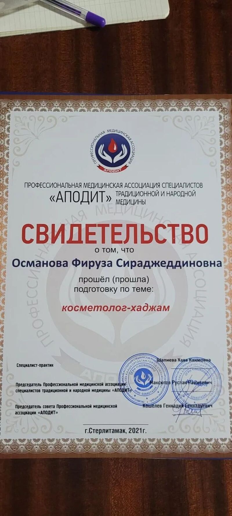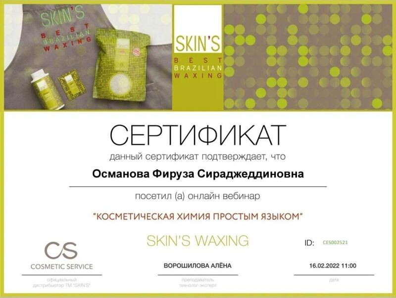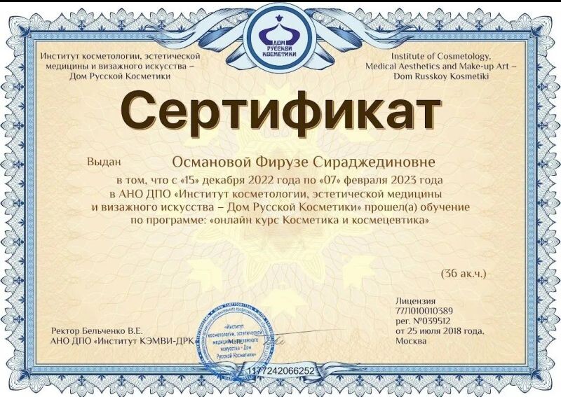- Свидетельство, косметолог-хаджам (с 2021 г.).