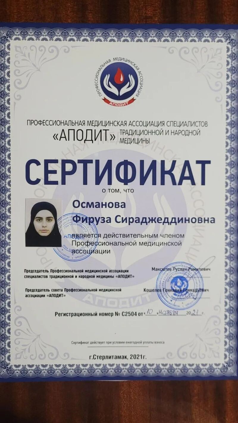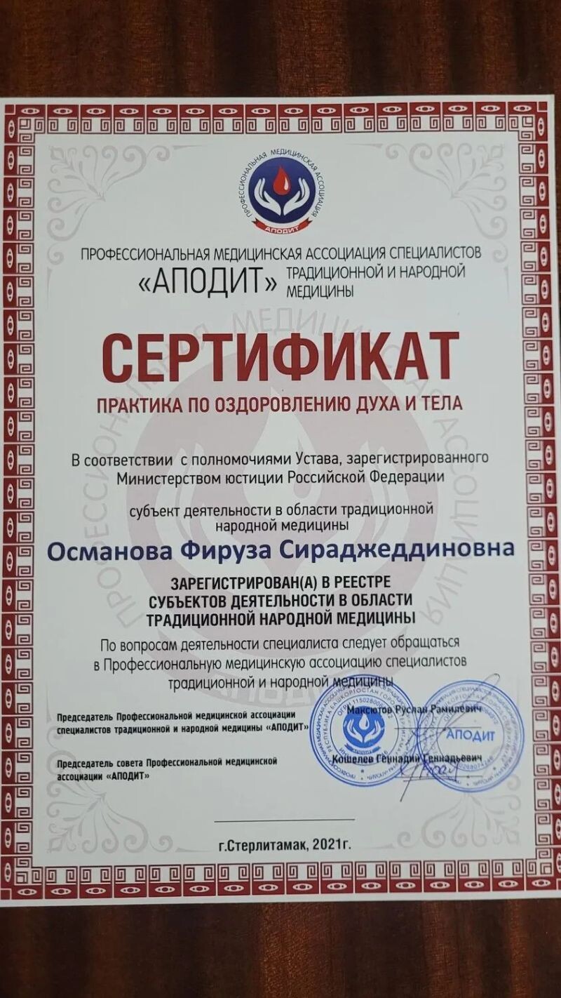 - Сертификат члена профессиональной медицинской ассоциации специалистов традиционной и народной медицины, 2021 г.