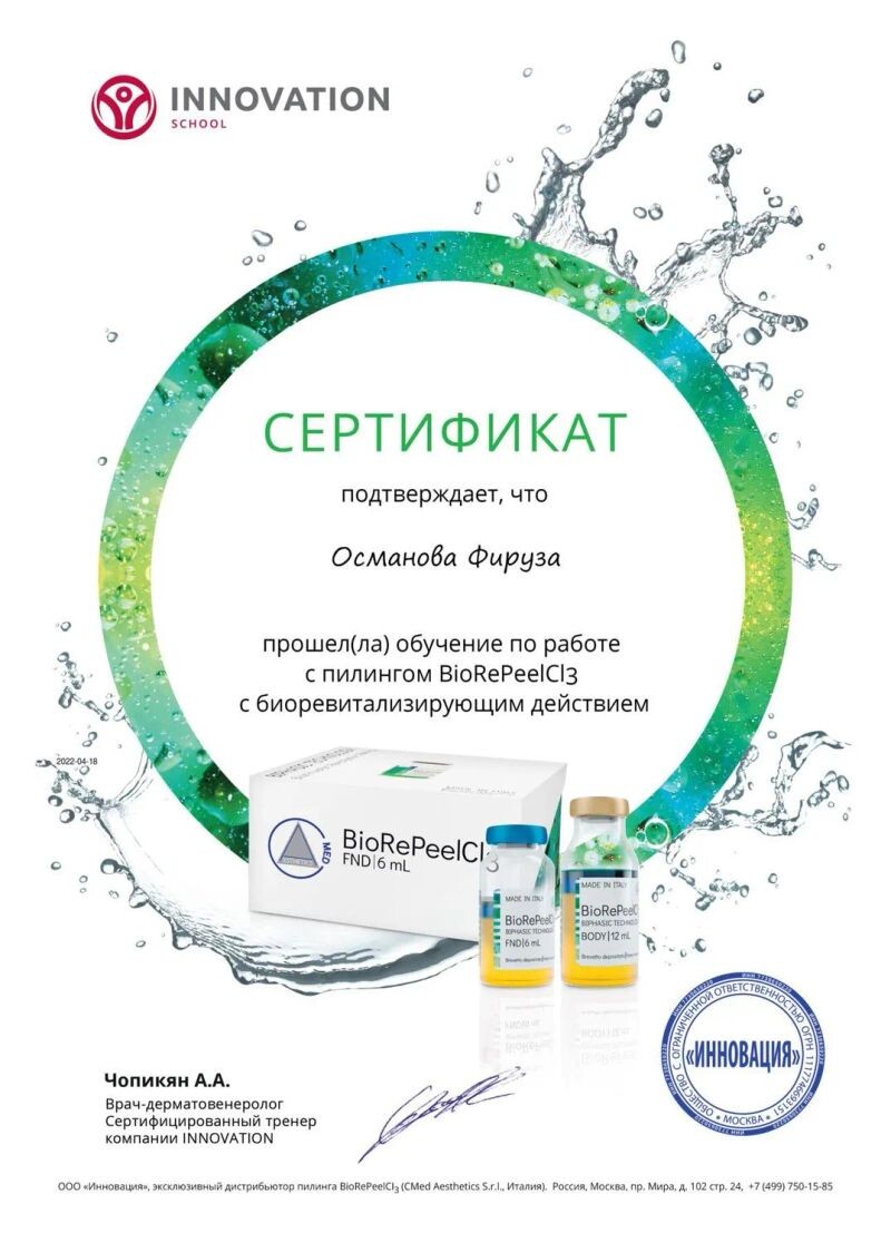- Сертификат об обучении пилингу BioRePeelClз (с 2022 г.).