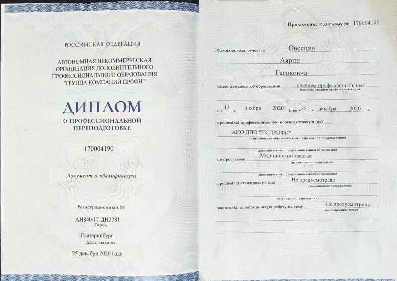 - АНО ДПО «Группа компаний профи», медицинский массаж, 2020 г.