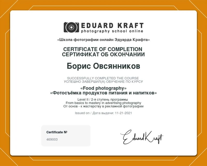 - Школа фотографии онлайн Эдуарда Крафта, курс «Фотосъёмка продуктов питания и напитков», 2-я ступень программы, 2021 г.